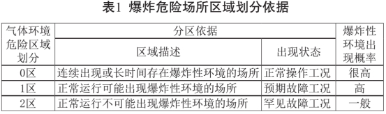 危險區(qū)域等級劃分過程中應(yīng)考慮的主要因素有[2-3,5]:(1)存在爆炸性物質(zhì)的可能性;(2)爆炸性物質(zhì)釋放量;(3)通風(fēng)條件;(4)與釋放源的距離。按照爆炸性危險物質(zhì)出現(xiàn)的頻繁程度和持續(xù)時間,可將爆炸性氣體環(huán)境分為0區(qū)、1區(qū)和2區(qū)三個區(qū)域,劃分依據(jù)見表1[3-5]。
