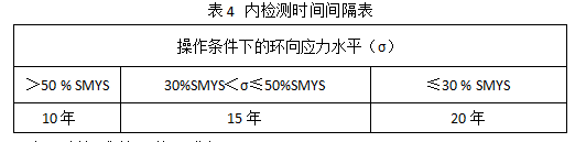 8.1.1、8.1.2、8.1.5規(guī)定管道投產(chǎn)3年內(nèi)完成完整性評(píng)價(jià),可選用的方法包括智能內(nèi)檢測(cè)、直接評(píng)價(jià)和壓力試驗(yàn)。輸油管道完整性評(píng)價(jià)間隔不超過(guò)8年,但管道內(nèi)檢測(cè)時(shí)間間隔需按照管道運(yùn)行壓力/操作條件折算出的環(huán)向應(yīng)力水平來(lái)查表4確定,最大時(shí)間間隔為10年至20年不等。所以低壓力運(yùn)行的管道可以有更長(zhǎng)的內(nèi)檢測(cè)時(shí)間間隔。