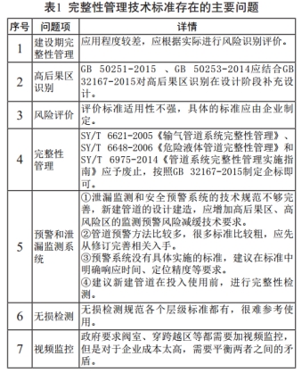 通過(guò)對(duì)近30家單位的調(diào)研,分析得出了目前油氣管道標(biāo)準(zhǔn)在管理、法律法規(guī)、標(biāo)準(zhǔn)體系和技術(shù)方面存在的近百個(gè)問(wèn)題,其中完整性管理方面存在的主要問(wèn)題見(jiàn)表 1。