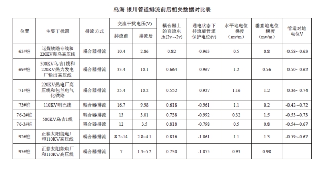 (1)石嘴山市惠農(nóng)縣正泰太陽能發(fā)電廠090#+ 至093#測試樁管道,與高壓線并行或交叉,距離為15米左右,同時(shí)還穿越包蘭鐵路,當(dāng)有電氣化機(jī)車通過時(shí)受雜散電流干擾嚴(yán)重,交流干擾電壓最大處在092#測試樁,為14V,超過了標(biāo)準(zhǔn)規(guī)定的10V。管道運(yùn)營管理方在092#、093#測試樁安裝了排流設(shè)施,采用去耦合器+銅接地排流,接地采用35平方毫米的20米長的裸銅電纜。
