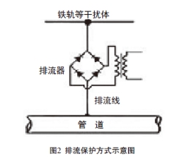 治理已運(yùn)行軌道交通系統(tǒng)存在的雜散電流, 需要在管道的合適位置引入排流裝置(如圖2所示)。這種做法盡管不如通過整改軌道交通供電回路的措施那樣經(jīng)濟(jì)有效,但在受技術(shù)和條塊分隔的行業(yè)壁壘等因素限制的情況下,不失為一種有效的減輕電性干擾危害、保護(hù)地下管道等金屬構(gòu)筑物安全的選擇。