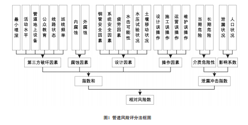 當(dāng)前,用于管道風(fēng)險(xiǎn)評(píng)價(jià)比較完整的方法為W.Kent Muhlbauer所提出的評(píng)分法,如圖1所示。其中“第三方破壞、腐蝕原因、設(shè)計(jì)原因、操作原因”評(píng)分的“指數(shù)和” 是表示管道事故發(fā)生的概率,由“介質(zhì)危險(xiǎn)性、影響系數(shù)”決定的“泄漏沖擊指數(shù)”是表示管道事故的損失。