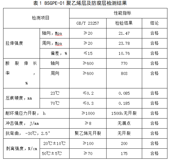 2012年以前,中石油還沒有自主品牌的聚乙烯防腐專用料投放市場(chǎng),寶雞石油鋼管公司高峰時(shí)期每年需要從市場(chǎng)上采購(gòu)聚乙烯防腐料近3萬(wàn)噸。2011~2014年,西南化工銷售分公司、獨(dú)山子石化分公司和寶雞石油鋼管有限責(zé)任公司三家產(chǎn)銷研單位聯(lián)合成立項(xiàng)目組,整合和利用自身的煉化資源和研發(fā)優(yōu)勢(shì),開發(fā)了自主品牌的“埋地鋼質(zhì)道聚乙烯防腐專用料BSGPE-01”,并通過了專家鑒定,性能達(dá)到國(guó)內(nèi)領(lǐng)先水平,質(zhì)量檢測(cè)結(jié)果見表1。