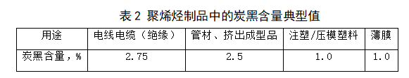 相關(guān)研究表明,炭黑是較好的紫外線穩(wěn)定劑,能夠通過吸收紫外線達(dá)到防老化目的。一般而言,一定細(xì)度的炭黑,濃度達(dá)到2%時(shí),即可起到很好的紫外屏蔽作用,考慮到一定的保險(xiǎn)系數(shù),用2.5%炭黑對(duì)聚烯烴可達(dá)到最佳防老化效果。而炭黑添加量在0.5%以下時(shí),防護(hù)效果很差。當(dāng)要求炭黑起穩(wěn)定和防老化作用時(shí),它的加入量約為2~3%;炭黑在各種塑料制品中的一般填充量見表2。