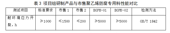該防腐料已實(shí)現(xiàn)工業(yè)化生產(chǎn)和鋼管涂覆應(yīng)用,累計(jì)生產(chǎn) 3000 余噸,成功應(yīng)用于柴北緣項(xiàng)目等管徑457毫米油氣管線,效果良好。其中 BSG-PE01、BSG-PE02 兩個(gè)牌號(hào)的產(chǎn)品還通過了中石油集團(tuán)公司新產(chǎn)品認(rèn)定,并列入了自主創(chuàng)新重要產(chǎn)品目錄。