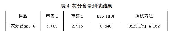 對(duì)上述各樣品進(jìn)行了灰分含量測(cè)試,結(jié)果見表4。