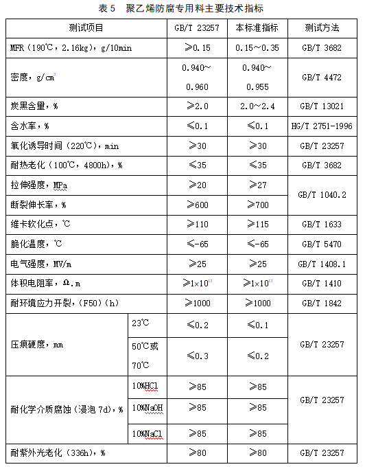 綜上所述,為避免灰分含量偏高影響對(duì)產(chǎn)品的耐環(huán)境應(yīng)力開裂性能,結(jié)合正常產(chǎn)品的灰分含量測(cè)試結(jié)果,本標(biāo)準(zhǔn)給出的灰分含量指標(biāo)為≤1.0%,其他各主要技術(shù)指標(biāo)見表5。