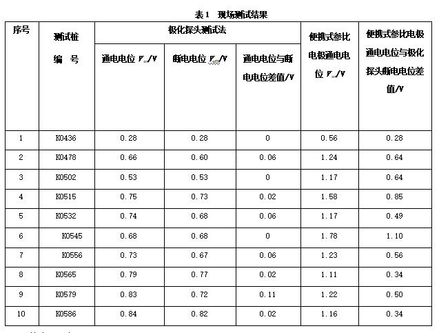 用極化探頭對西南片區(qū)某管段陰極保護效果進行了現(xiàn)場測試。該管段地處城市周邊,陰極保護方式為外加強制電流和犧牲陽極相結(jié)合。周圍有較多電氣化鐵路、高壓輸電塔、銅礦廠,受雜散電流的干擾比較嚴重。用極化探頭和便攜式參比電極測量的電位見表1。
