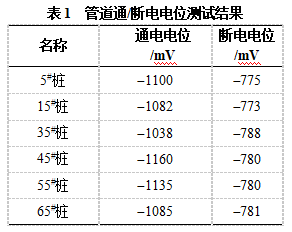 1#集氣站至1#閥室之間的管道采用外加電流陰極保護(hù)方式,陰極保護(hù)站設(shè)在集氣站。在陰保站安裝電流斷續(xù)器,并在不同的測(cè)試樁位置進(jìn)行通/斷電電位測(cè)試,結(jié)果見(jiàn)表1。