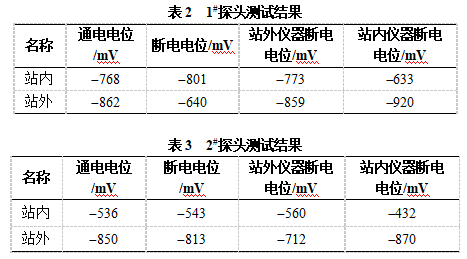 通過(guò)測(cè)試發(fā)現(xiàn)末站站內(nèi)外干擾最嚴(yán)重,特別是絕緣法蘭兩端的電位干擾影響最大。在該處安裝2個(gè)測(cè)試探頭、離站最近的站外測(cè)試樁處安裝測(cè)試試片,探頭極化48h后,測(cè)試1#探頭和2#探頭的通電和斷電電位,然后分別在恒電位儀處斷開(kāi)站外和站內(nèi)恒電位儀,再測(cè)試探頭處的電位,結(jié)果見(jiàn)表2、3。