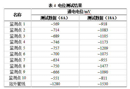 由表2 、3可知,斷電電位有時(shí)比通電電位高,是由于陽(yáng)極位置分布造成的,同時(shí)站內(nèi)外的斷電電位都沒(méi)達(dá)到-850mV的最低保護(hù)電位要求。當(dāng)站外管道電位為-850mV時(shí),站內(nèi)管道都沒(méi)達(dá)到陰極保護(hù)準(zhǔn)則要求。為了進(jìn)一步驗(yàn)證干擾程度的大小,將站內(nèi)管線電位提高(電流從6A增加到18A),測(cè)試站內(nèi)外管道電位變化,結(jié)果見(jiàn)表4。