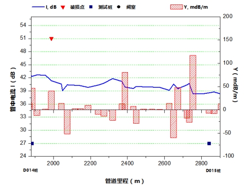 根據(jù)表1所示的評價準側, D014樁+105 m外防腐層破損點斷電電位-817 mV,若土壤電阻率偏低則腐蝕的風險會增大,同時此處ACVGdB值為67,相對加大,可作為有效的直接檢測與評價點,綜合以上因素判定為二類破損點。