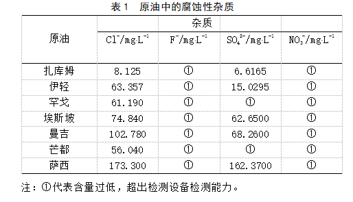 原油中的硫、酸等高分子有機(jī)腐蝕性雜質(zhì)在溫度高于220 ℃時(shí)才會(huì)對(duì)金屬材料構(gòu)成腐蝕[3],管輸條件下對(duì)管道造成腐蝕的主要是低分子無機(jī)腐蝕性雜質(zhì)。對(duì)扎庫姆原油、伊朗輕油等原油的腐蝕性雜質(zhì)分析測(cè)試(見表1)表明,原油中的腐蝕性雜質(zhì)主要為氯化物、氟化物、硫酸鹽和硝酸鹽。此外,某些原油中還溶解有一定量的硫化氫、二氧化碳等腐蝕性氣體,這些氣體也會(huì)溶解到原油析出水中,進(jìn)一步加劇管道的腐蝕。