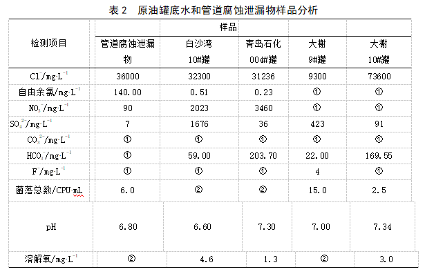 經(jīng)對(duì)原油罐底水和管道腐蝕泄漏物進(jìn)行樣品分析(見表2),判斷在管道輸送過程中,原油中的水溶性腐蝕雜質(zhì)向原油析出水中溶解、濃縮,形成高礦化度水,在管道中聚集,從而造成管道腐蝕。腐蝕泄漏管道初期泄漏物分析表明,管道泄漏物與罐底水類似,均為高礦化度水,其氯離子含量最高達(dá)7%(w,質(zhì)量分?jǐn)?shù)),但細(xì)菌含量總體不高,可能是罐底水中的自由余氯一定程度上抑制了細(xì)菌的生長(zhǎng)。測(cè)試還表明,罐底水中還含有一定的溶解氧,氧的存在進(jìn)一步加劇了管道的腐蝕。