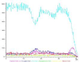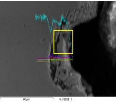 對(duì)某站場(chǎng)發(fā)生內(nèi)腐蝕泄漏的管道進(jìn)行了切割制樣,宏觀觀察發(fā)現(xiàn)為管道底部?jī)?nèi)壁點(diǎn)蝕,掃描電鏡下顯示為垢下腐蝕形貌。EDX分析表明,管道腐蝕坑內(nèi)的垢物主要由碳、鐵、氧、錳、硅、鈣等元素組成,越靠近腐蝕坑底,垢物中的氧含量越高,鐵含量相應(yīng)降低,管道腐蝕產(chǎn)物主要為鐵的氧化物(見圖3)。由此可以看出,原油輸管道內(nèi)腐蝕為有氧環(huán)境中高礦化度水造成的電化學(xué)腐蝕。