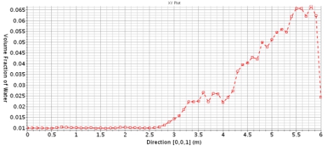 從積水段管道底部水延管程分布曲線(見圖5)可以看出,盲管段0~2.7 m處水的體積分?jǐn)?shù)為1.0%左右,表明水基本被油帶走,未出現(xiàn)沉積,但從三通管口2.8 m的距離往后,因流速很低水開始沉積,水的體積分?jǐn)?shù)開始升高,最高可達(dá)6.5%,表明盲管中存在明顯的水沉積現(xiàn)象。