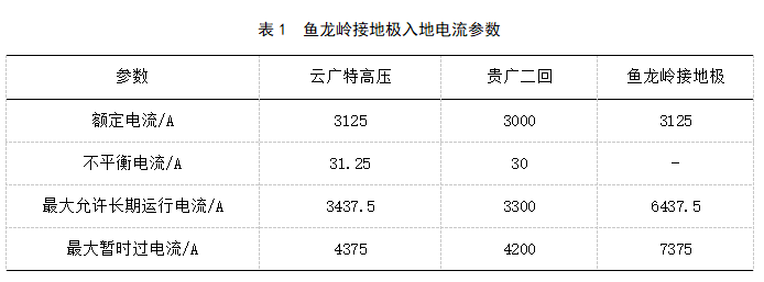 直流輸電系統(tǒng)可以采用雙極和單極兩種運行方式。在雙極運行方式中, 利用正負(fù)兩極導(dǎo)線和兩端換流站的正負(fù)極相連, 構(gòu)成直流側(cè)的閉環(huán)回路。在雙極對稱運行時,接地極入地電流在額定電流的1%以內(nèi);當(dāng)雙極不對稱運行時, 流過接地極的電流為兩級運行電流之差。在單極大地返回運行方式中, 流過接地極的電流即為直流輸電運行電流。以魚龍嶺接地極為例,其入地電流見表1。