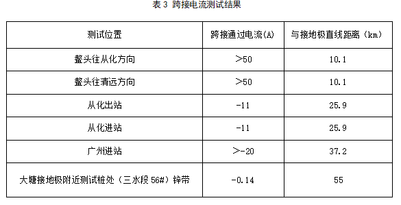 為綜合確定干擾程度,分別對站場絕緣接頭跨接處的電流進(jìn)行檢測,表3為魚龍嶺接地極陰極放電3000A時的檢測結(jié)果。