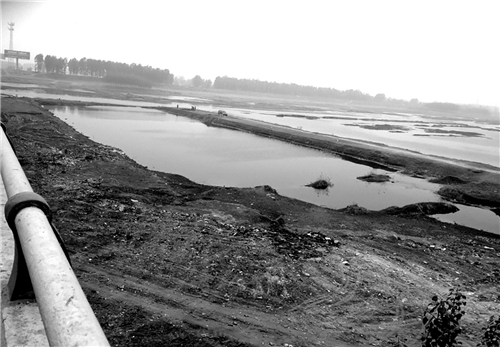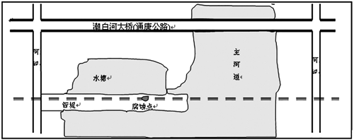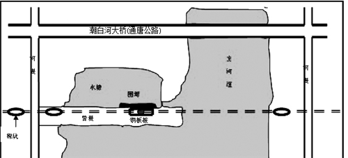 潮白河穿越管段與通唐公路(潮白河大橋) 平行間距80m,河道內(nèi)管道東側(cè)有管堤180m,其余200多米為主河道,主河道內(nèi)及管堤兩側(cè)常年有水。管堤寬11m,管道位于管堤南側(cè)3.5m處,腐蝕點(diǎn)位于管堤156m處, 管堤南側(cè)是一個長140m、寬50m的水塘,水深約2.5m(圖2)。