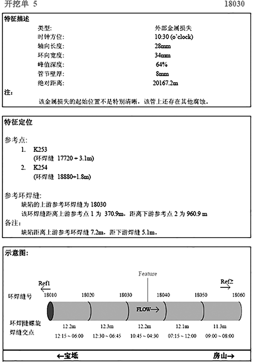 管道缺陷腐蝕點(diǎn)的位置,一般是根據(jù)管道缺陷修復(fù)開挖單所給定的地面標(biāo)記點(diǎn),準(zhǔn)確測量參考環(huán)焊縫的位置(圖4),再依據(jù)實(shí)際開挖時數(shù)據(jù)偏差來確定。