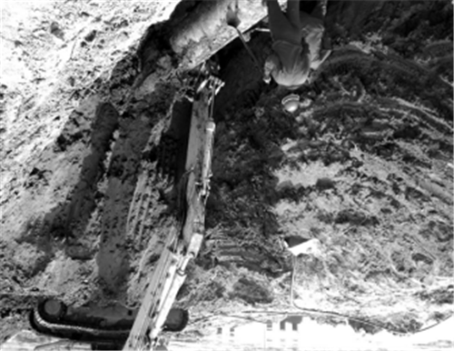 管道腐蝕缺陷修復(fù)作業(yè)坑以腐蝕點(diǎn)為中心, 向兩側(cè)各延伸15m-20m,作業(yè)坑挖深至套管底部0.5m,該段管道埋深5m(根據(jù)雷迪探測),作業(yè)坑挖掘深度為6m-7 m,長40m,寬6m。土方挖掘采用機(jī)械開挖,現(xiàn)場設(shè)專人指揮(圖9)。作業(yè)坑坡頂嚴(yán)禁堆物及附加荷載。作業(yè)坑一次成型,且作業(yè)坑內(nèi)無水,為管道缺陷修復(fù)創(chuàng)造了良好的條件。