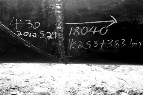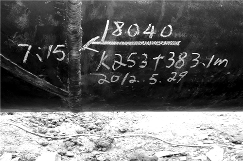 通過查找管道缺陷點(diǎn)附近的三道環(huán)焊縫與螺旋焊縫相交位置,都符合內(nèi)檢測報告給定的數(shù)值。但是相應(yīng)的管體表面卻沒有腐蝕缺陷點(diǎn)。為了確認(rèn)腐蝕缺陷位置,現(xiàn)場從電腦中選取其它定位參考點(diǎn), 該管段原有套管且套管與輸油管道外壁存在支撐點(diǎn)(圖13),選取一個支撐點(diǎn),再次對腐蝕缺陷點(diǎn)進(jìn)行定位。且與原來內(nèi)檢測報告給定的數(shù)值相吻合。