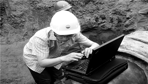 另外,為準(zhǔn)確定位管道與河道平面的相對位置,首先用探管儀探測定位,其次在緊靠河堤兩側(cè)內(nèi)的管道上開挖兩個探坑,通過實(shí)際測量確定管道位置,確定管道缺陷腐蝕點(diǎn)修復(fù)作業(yè)坑開挖位置。