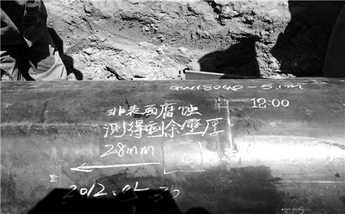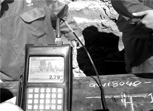 至此,幾方面的數(shù)據(jù)指向管道缺陷點(diǎn)就在內(nèi)檢測所給定的管體部位,因而采用金屬測厚儀對相應(yīng)部位的管壁進(jìn)行測量。測量結(jié)果為該位置管體壁剩余2.79mm(圖14)、軸向長度為28mm、環(huán)向長度34mm(圖15)。該管道壁厚為8mm,腐蝕缺陷深度為64%與內(nèi)檢測報告給定的數(shù)值吻合,只是管道腐蝕缺陷為非外部腐蝕。