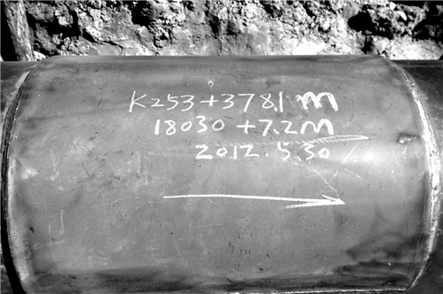 為了確認(rèn)腐蝕點(diǎn),先向下游用氣焊切割套管軸向長度5m、環(huán)向?qū)挾?.3m,找到環(huán)焊縫后,確認(rèn)焊縫的編號,重新界定腐蝕點(diǎn)位置。因下游沒有環(huán)焊縫按照以上工藝尋找上游環(huán)焊縫(圖12)。