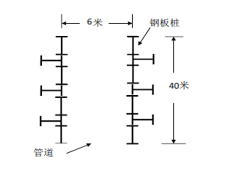 經(jīng)過測算,作業(yè)坑支護(hù)采用11m長的32#b型工字鋼樁,沿管道兩側(cè)各打樁178根,每側(cè)鋼樁一正一反連續(xù)排放,兩側(cè)鋼樁間距6m(圖6)。
