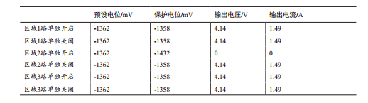 站場區(qū)域陰極保護系統(tǒng)開啟后,干線陰極保護系統(tǒng)恒電位儀輸出電壓電流即為零,為確認是區(qū)域陰極保護系統(tǒng)恒電位儀的哪一路對線路陰極保護系統(tǒng)存在干擾,將3路區(qū)域陰極保護系統(tǒng)恒電位儀分別通斷,觀察線路陰極保護系統(tǒng)恒電位儀的輸出,見表1: