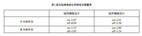 同時調(diào)整干線陰極保護系統(tǒng)恒電位儀的輸出,使得其輸出電流維持在未受干擾的水平,然后與區(qū)域陰極保護系統(tǒng)恒電位儀同步通斷,測得干線進出站絕緣接頭兩端的電位如表3所示: