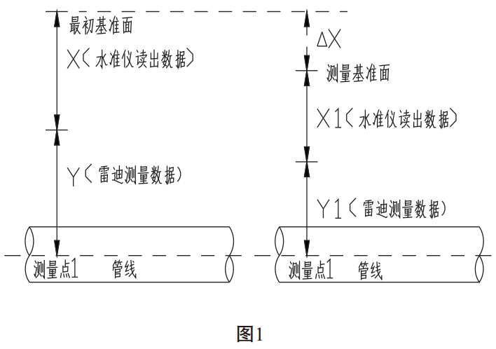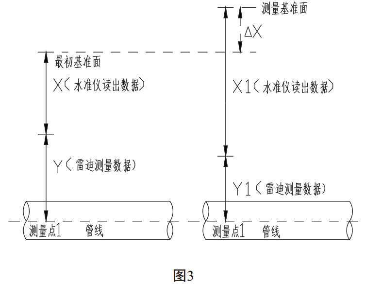 (1)同一測量點(diǎn)進(jìn)行下次測量時(shí),如果所選擇測量基準(zhǔn)面較最初基準(zhǔn)面低,△X為基準(zhǔn)面的差值,通過現(xiàn)場實(shí)際測量確定。如圖2:
