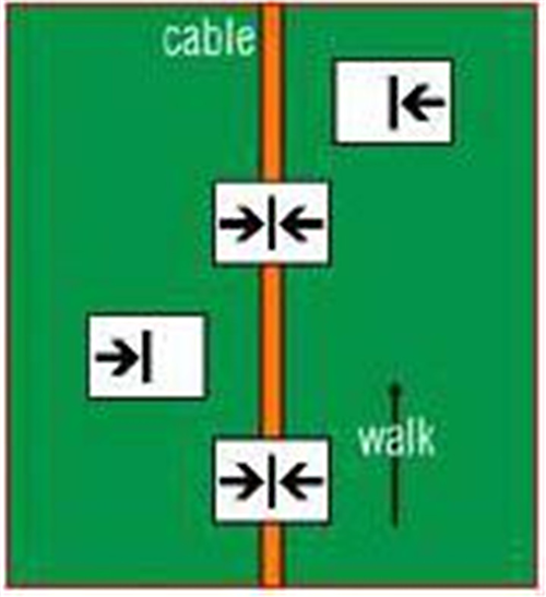 ( 2)把接收機調(diào)到谷值法,沿著光纜走動并左右擺動接收機,箭頭對準的點就是光纜的位置。如圖5所示。