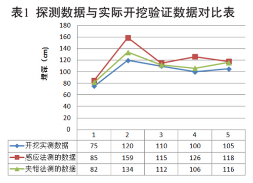通過實際開挖驗證,我們可以分析探測儀探測數(shù)據(jù)與實際埋深間的誤差。下面以武漢光纜支線中洲大橋段的5處測量點的數(shù)據(jù)進行分析。如圖9、表1所示。