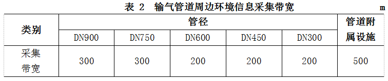 (3)管道周邊環(huán)境信息數(shù)據(jù)采集: GB 32167-2015中輸氣管道的潛在影響區(qū)域是依據(jù)潛在影響半徑計算的可能影響區(qū)域,因此,用輸氣管道潛在影響半徑制定了管道周邊環(huán)境信息采集帶寬(表2)。d2