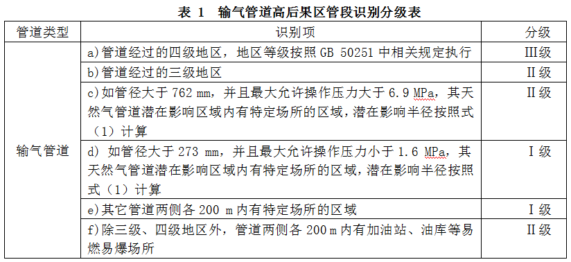 (2)高后果區(qū)識別和分級:依據(jù)GB 32167-2015高后果區(qū)管段識別分級表(表1)識別、劃分、采集管道高后果區(qū)的數(shù)據(jù)信息。