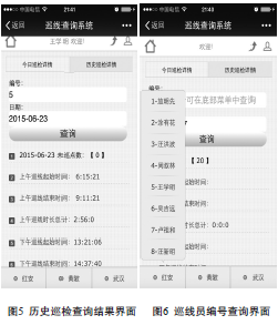 (4)線(xiàn)路管理員和巡線(xiàn)工可根據(jù)需要自定義日期后輸入對(duì)應(yīng)的人員編號(hào),即可顯示查詢(xún)的歷史結(jié)果(見(jiàn)圖5)。巡線(xiàn)工的編號(hào)可在界面下方查詢(xún)(見(jiàn)圖6)。為方便手機(jī)上使用,默認(rèn)日期為當(dāng)天日期。