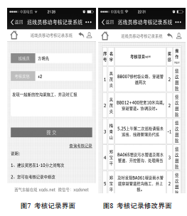 通過(guò)電腦編程在手機(jī)客戶(hù)端建立隨手記網(wǎng)絡(luò)平臺(tái)界面,由線(xiàn)路管理員記錄巡線(xiàn)過(guò)程中的作業(yè)內(nèi)容,并及時(shí)對(duì)巡線(xiàn)工的工作表現(xiàn)進(jìn)行考評(píng)(見(jiàn)圖7),該記錄會(huì)及時(shí)更新到后臺(tái)數(shù)據(jù)庫(kù)中。