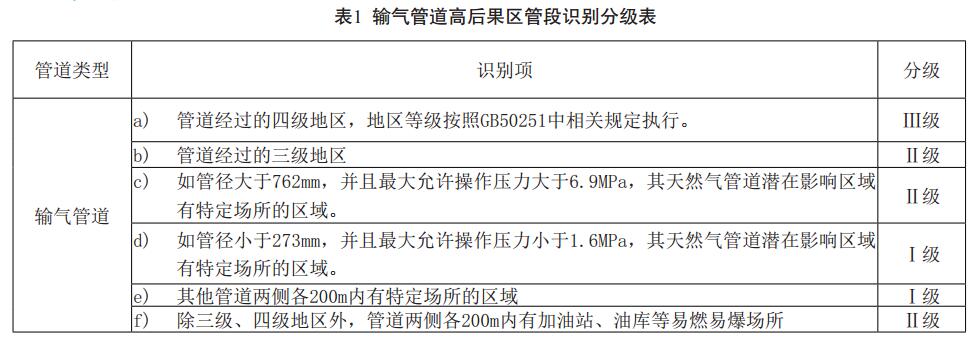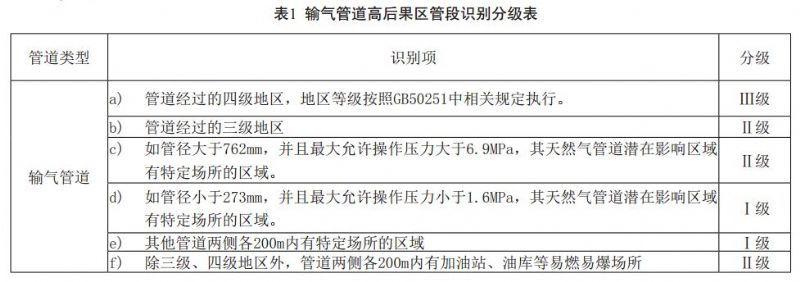 規(guī)范中規(guī)定的輸氣管道高后果區(qū)識別管段分級見表1。