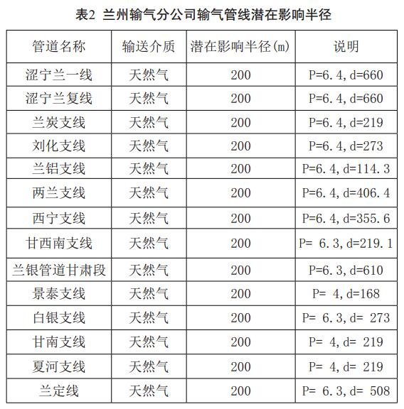 蘭州輸氣分公司管轄管線不存在表1中c、 d類情況,管線的潛在影響半徑均為200m,見表2。