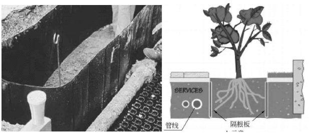 (3)危害等級(jí)評(píng)價(jià)為2級(jí)的樹種38種,這些植物根系主要表現(xiàn)為板根,側(cè)根發(fā)達(dá),主根發(fā)達(dá)程度一般,根系生長(zhǎng)深度能夠達(dá)到管道埋深,但因根系強(qiáng)度較管材低,對(duì)管材本質(zhì)安全影響相對(duì)較小,主要危害防腐層和收縮套等。在條件允許的情況下,不應(yīng)種植在管道周邊。如果不可避免種植這類樹種,應(yīng)在種植時(shí)安裝阻根板,以降低根系對(duì)管道的危害(見圖 4)。