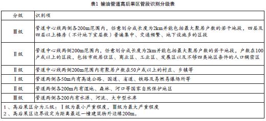 管段劃分以后,可按表1對每一管段內(nèi)的高后果情況進行分級識別,分級識別可以使設(shè)計人員進行路由優(yōu)化時更加明白哪些位置是優(yōu)化的重點地段,進而使設(shè)計優(yōu)化更加清晰。