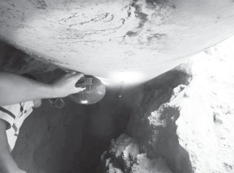 管道敷設(shè)時多采用大開挖方式穿越黃土大沖 溝,由于黃土的濕陷性,結(jié)構(gòu)破壞后,受降雨、農(nóng) 田灌溉等因素影響極易造成管溝水土流失,出現(xiàn)陷 穴,當陷穴進一步擴大形成貫通的潛蝕環(huán)境時管道 就會懸空。(圖3、4)