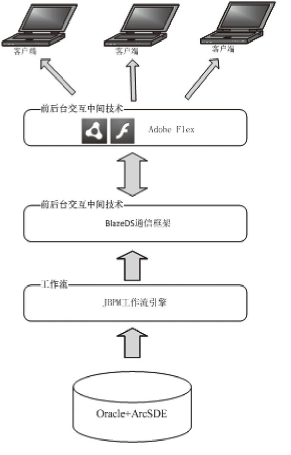 水工保護數(shù)據(jù)管理系統(tǒng)采用Flex技術作為表現(xiàn)層,通過BlazeDS框架實現(xiàn)前后臺的數(shù)據(jù)通信,以JBPM工作流引擎為基礎實現(xiàn)水工數(shù)據(jù)的錄入審核,通過Oracle和ArcSDE管理屬性數(shù)據(jù)空間數(shù)據(jù),系統(tǒng)總體架構(gòu)如圖1所示。
