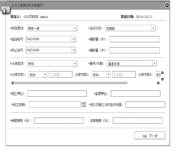 1) 在線單條數(shù)據(jù)錄入是由用戶在GIS系統(tǒng)中填寫所屬管線、起止樁號、預算費用和結(jié)算費用等信息審核后上傳至系統(tǒng)中。