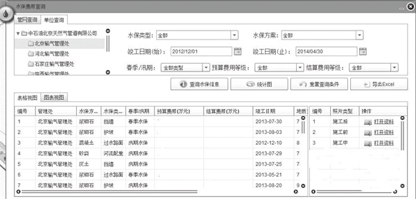 模塊以單位和管網(wǎng)為查詢方式,以水保類型、水保材料、竣工日期、樁號位置、春季/汛期水工為查詢條件,以表格和統(tǒng)計圖為展示形式,快速準確、直觀、多角度的展示水工保護工程實施情況,進行多樣化的信息統(tǒng)計分析。