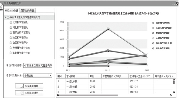該模塊以管理單位、管線為分析依據(jù), 展示水工保護費用歷年的投入情況,同時統(tǒng)計管線1公里、10公里、50公里、100公里的平均水保工程造價,如圖6所示。