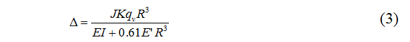 式中,Δ為管道水平徑向最大變形;J為管道變形滯后系數,宜取1.5;K為管道基座系數;R為管道半徑;E為管道彈性模量;I為單位長度管壁截面慣性矩;E′為地基系數。