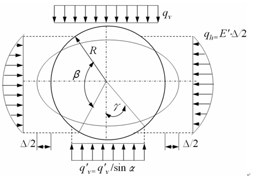 Spangler-Iowa方法管道示意如圖 2所示,作用于管頂的垂直載荷按均布載荷考慮,其分布寬度與管道外徑相同。管底承受地基垂直反力,均勻作用于圓心角2γ,管側承受土壤彈性抗力,其強度為二次拋物線規(guī)律分布,作用范圍對應圓心角β,最大抗力qh位于水平直徑的兩端。